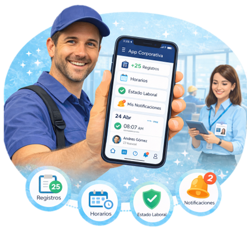 App móvil intuitiva para colaboradores y supervisores. Consulta de registros, horarios, estados y notificaciones desde cualquier lugar.