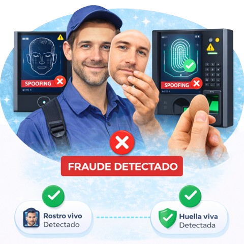 Algoritmos de detección de rostro vivo y huella viva que eliminan marcaciones fraudulentas y garantizan identidad real.