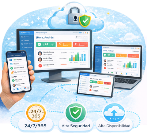 Sistema en la nube accesible 24/7/365 desde cualquier dispositivo, con alta disponibilidad y seguridad de la información.