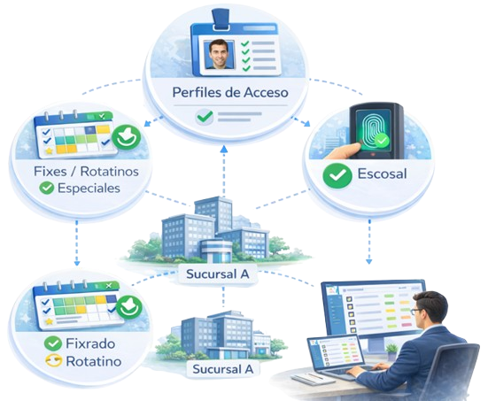 Configuración flexible de horarios fijos y rotativos, turnos especiales, tolerancias, perfiles de acceso y control por áreas, sedes o sucursales. Permite una gestión eficiente del tiempo laboral y el control de accesos según roles definidos.